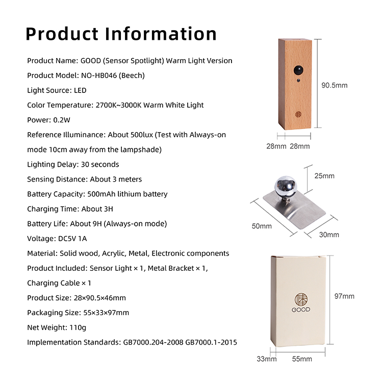 - Rechargeble: built-in 500mAh rechargeable battery, lasts for maximum 8 hours in constant light mode and 2-3 month in automatic lighting mode.