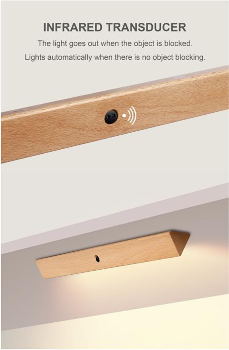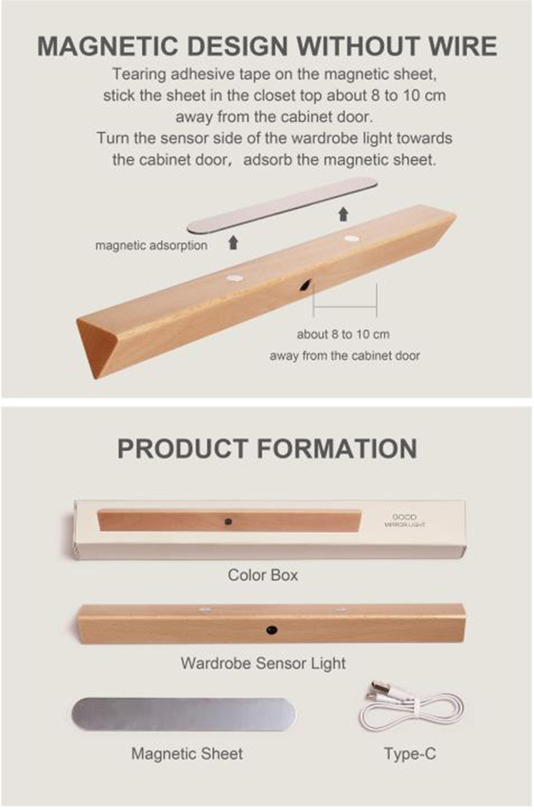 - 【Made of High Quality】Wardrobe Sensor Light is made of Beech wood. Built-in 500mAh lithium battery. Dimensions: 11.81" x 1.22'' x 1.10" (L x W x H); Beech.Package Include:1 ×Wardrobe Sensor Light ,1 ×Magnetic sheet,1 × Type-C