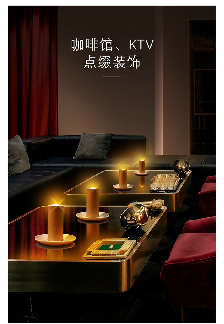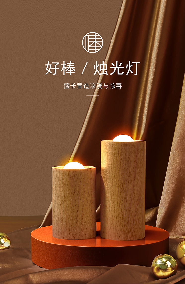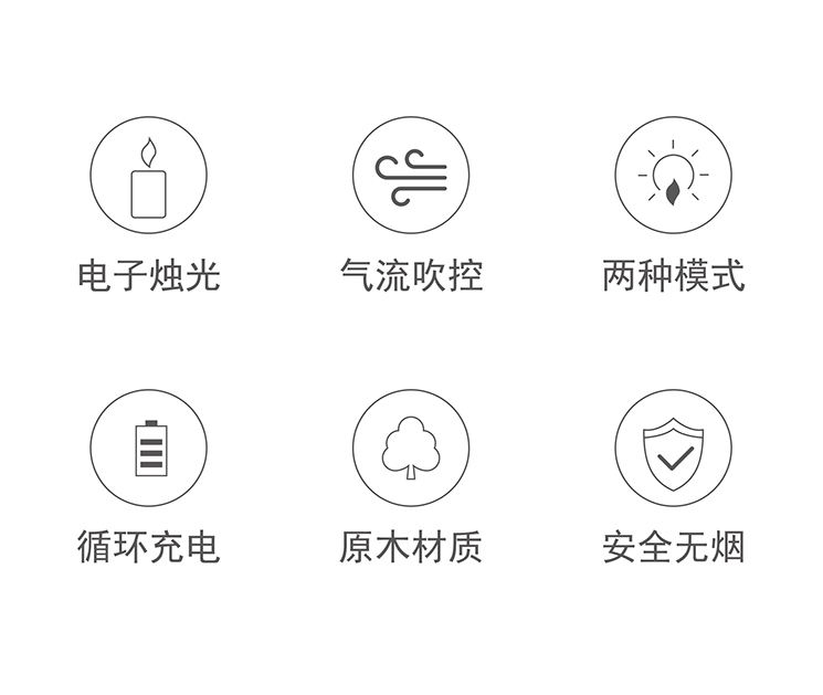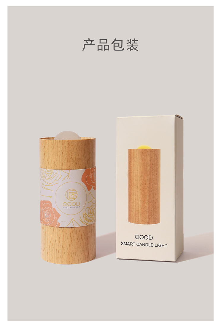 | 创意说明: | 电子烛光 安全无烟 智能气流吹控 仿真体验 内置1500毫安锂电 循环充电 原木材质 有颜有质感 |