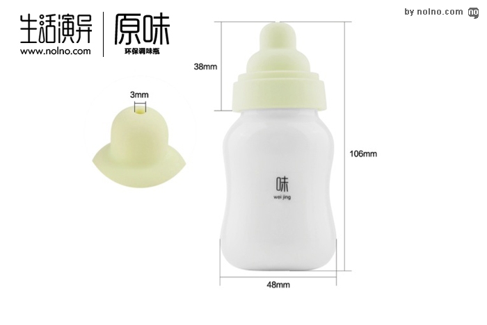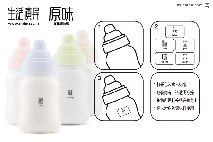 | 创意说明: | 好生活,需要对心情的合理调节;一道好菜,需要对味道的平衡控制。一奶瓶的调味,让你可以调出美味,满足味觉需要。又可以让你忆起母爱的美好、温和,产生温馨感觉。并且造型可爱有趣,让你身心体会满足的同时;又把趣味带进厨房,为你的生活添彩。 |