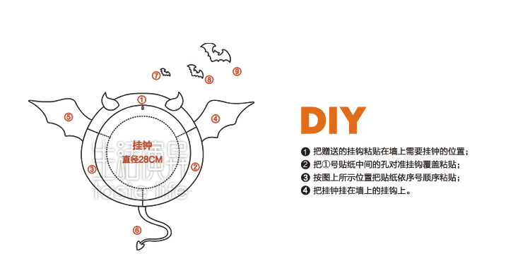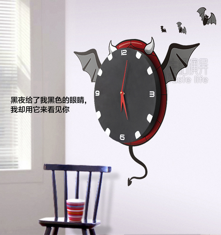 花颜(墙贴挂钟)夜蝙蝠——这是一款集时间显示与家居装饰功能于一体的“3D可移除式墙贴挂钟”环保产品,采用全新透明环保贴纸与优质环保塑料为制作材料,通过优良的工艺打造而成。创意钟饰与卡通蝙蝠形象的墙贴结合,而蝙蝠头上白色的兽角搭配红色的圆边,更显此蝙蝠的王者之势,也传达时间独有的魔力。立体墙贴遇上艺术挂钟,随爱DIY,尽显3D、环保便利创意家居品味。