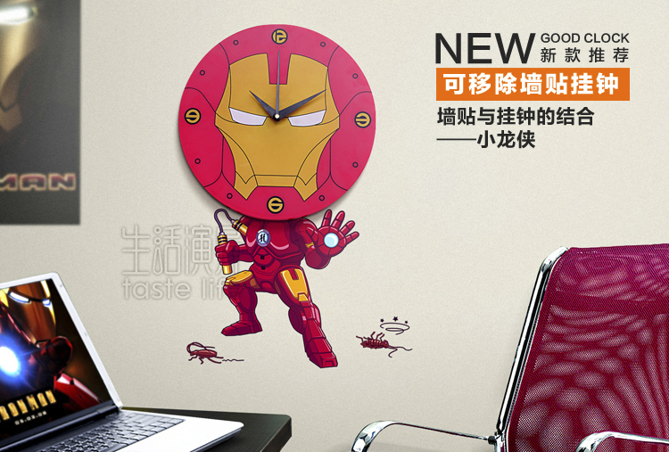 花颜(墙贴挂钟)小龙侠——这是一款集时间显示与家居装饰功能于一体的“3D可移除式墙贴挂钟”环保产品,采用全新透明环保贴纸与优质环保塑料为制作材料,通过优良的工艺打造而成。挂钟将李小龙的经典动作造型与钢铁侠形象墙贴巧妙结合,当钢铁侠搭配上双节棍,“喀喳”一声,让世界不再存在打不死的蟑螂。立体墙贴遇上艺术挂钟,随爱DIY,尽显3D、环保便利创意家居品味。