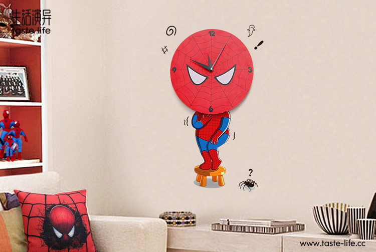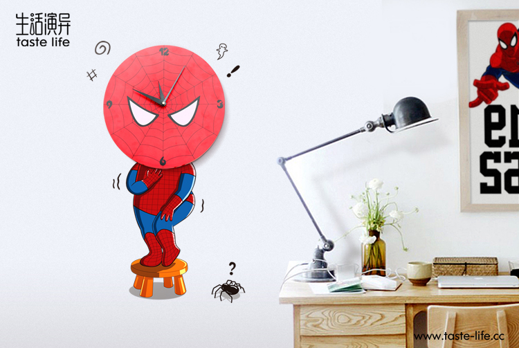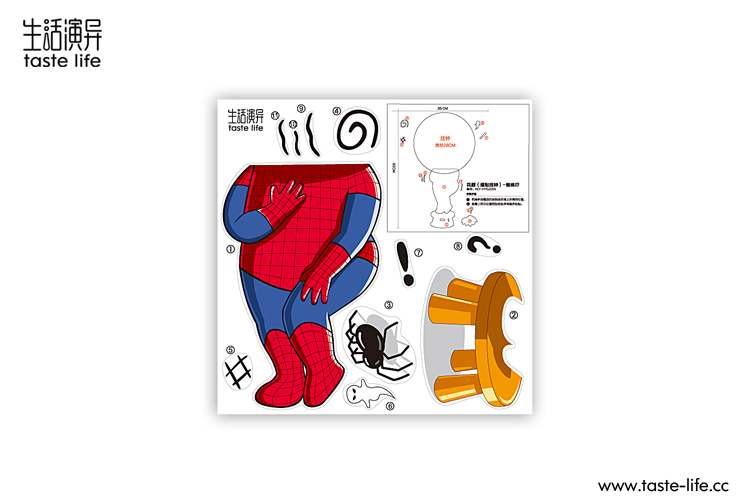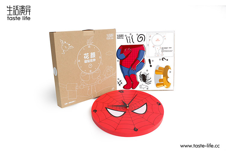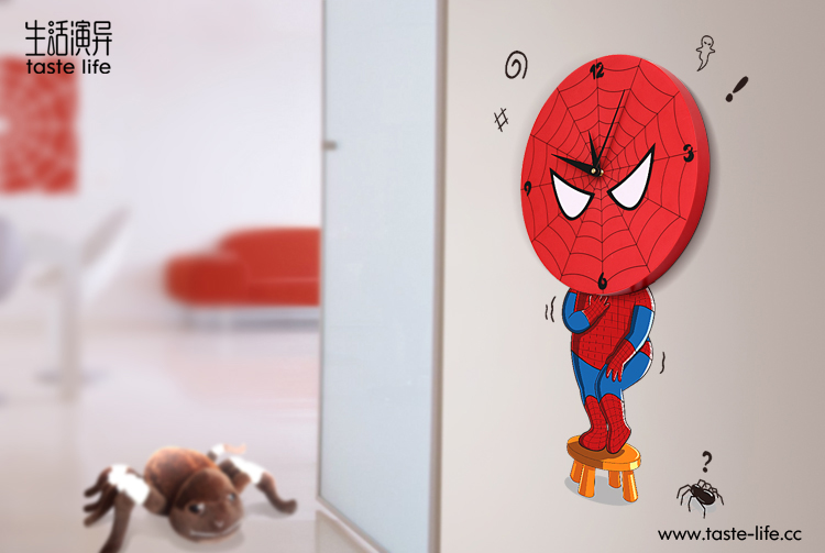 | 创意说明: | 以一贯为勇敢代言的蜘蛛侠却被小蜘蛛吓到了的动作表情为主画面,将墙贴与创意钟饰结合,原来蜘蛛侠也怕小蜘蛛,让人咧嘴一笑。立体墙贴遇上艺术挂钟,随爱DIY,尽显3D、环保便利创意家居品味 |