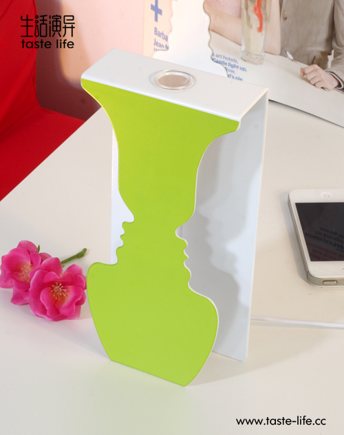 此款创意产品以面对面人脸的形状构成花瓶视觉主体,配合LED灯光使沟通相互辉映,更增加产品的创意性、实用性和装饰性。铁质烤漆材质内嵌玻璃小花瓶,优质的选材一流的工艺,多种不同供电方式让灵感随心点亮,整个造型充满创意性和哲理性,使思想内涵与沟通艺术的理念传达更为生动传神,让家居生活增色添彩更有品味。 |