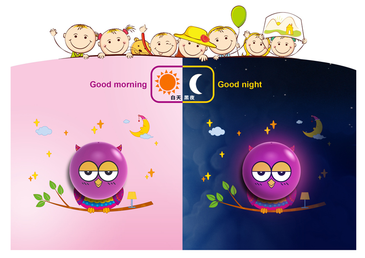 【产品描述】本款产品创意的把墙贴和小夜灯结合在一起组合猫头鹰图样,赋予了小夜灯更多的功效、更多的内涵。光控的人性化设计,解除了您每天想着开、关的烦扰;环保节能LED光源、进口环保原料的搭配环保又节能,功耗每年还不足一度电;温和的灯光,晚上既可以有一定的光亮又不会刺眼而影响休息;备用开关,更是让您开、关随心。搭配墙贴贴在墙上更是增加了空间里的活跃元素,更受孩子的喜爱。