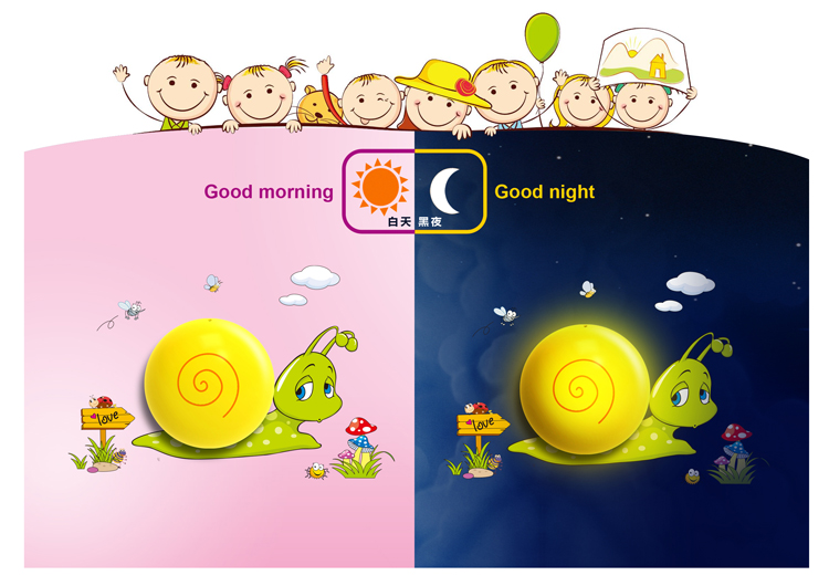 【产品描述】本款产品创意的把墙贴和小夜灯结合在一起组合蜗牛的图样,赋予了小夜灯更多的功效、更多的内涵。光控的人性化设计,解除了您每天想着开、关的烦扰;环保节能LED光源、进口环保原料的搭配环保又节能,功耗每年还不足一度电;温和的灯光,晚上既可以有一定的光亮又不会刺眼而影响休息;备用开关,更是让您开、关随心。搭配墙贴贴在墙上更是增加了空间里的活跃元素,更受孩子的喜爱。