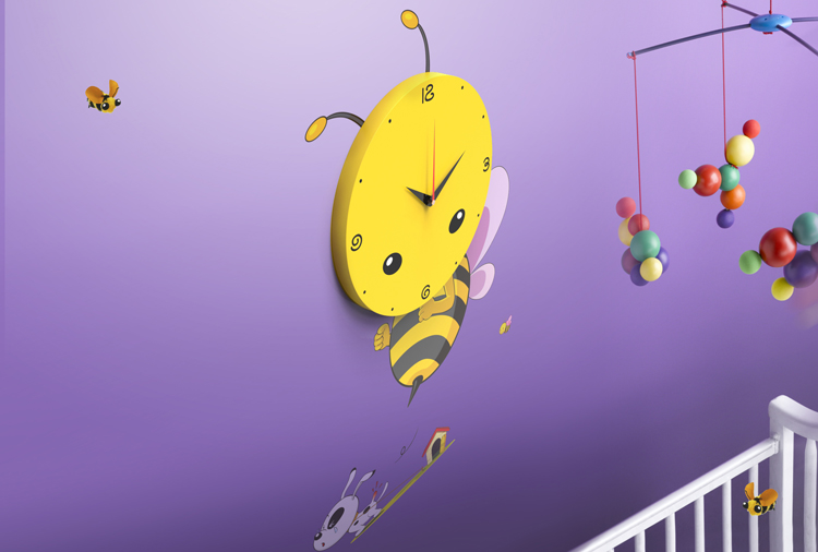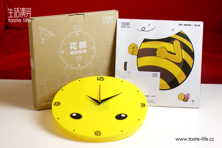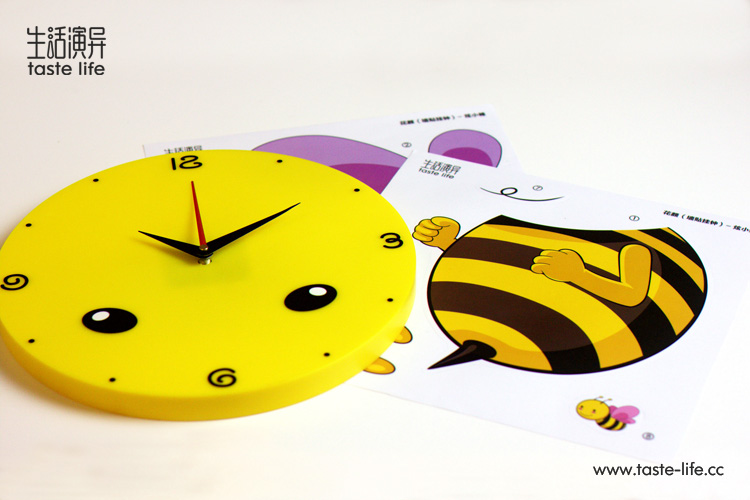 | 创意说明: | 创意挂钟与小蜜蜂卡通幽默的贴纸图案相结合,淡定无比而又一脸无辜的小蜜蜂跟抓狂的狗狗形成强烈对比,让人忍俊不禁的同时更加浮想联翩,让画面情节化立体化,充满互动搞笑的意味。 |