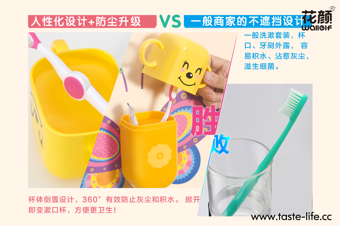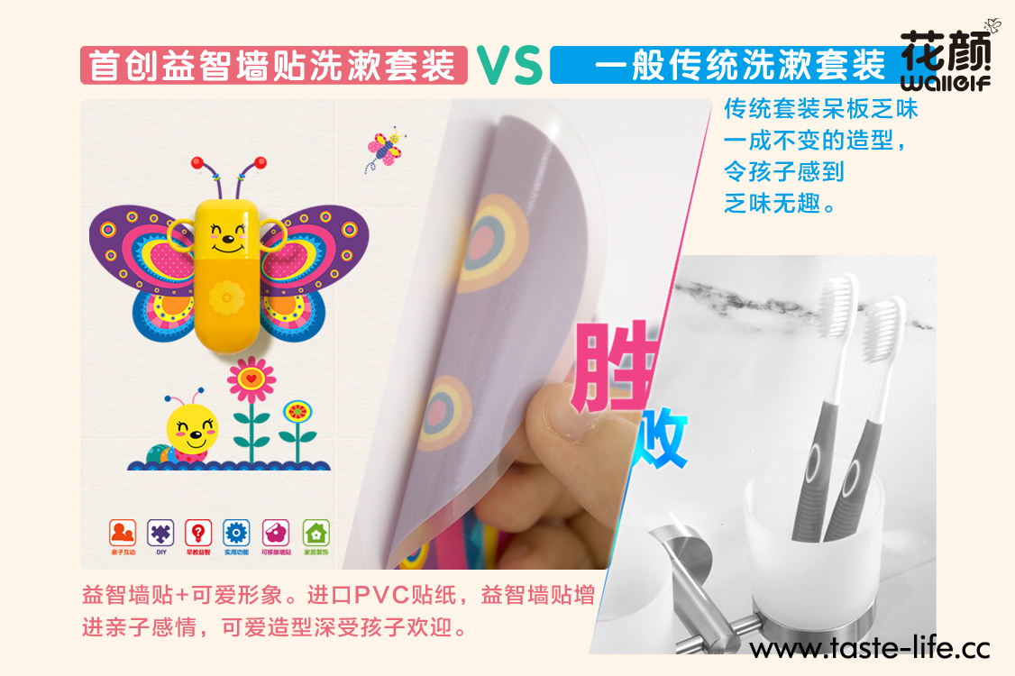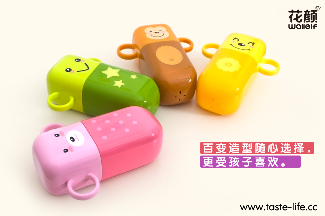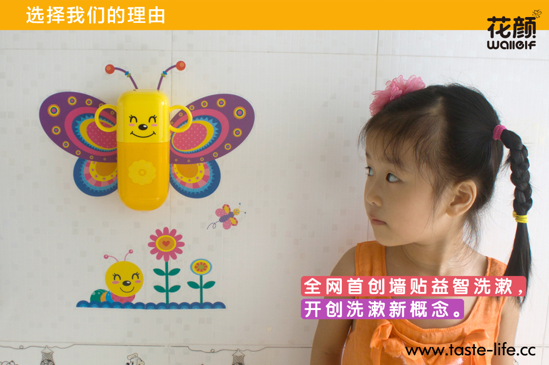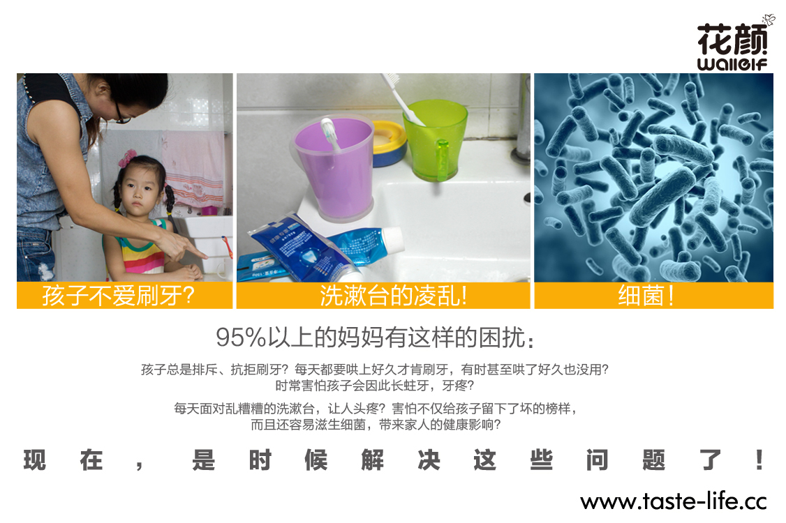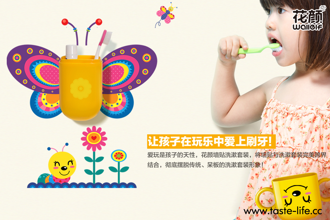 | 创意说明: | 要孩子规规矩矩的刷牙,很多时候都是一件让妈妈头疼的事,爱玩是孩子的天性,何不让孩子在玩乐中,自觉刷牙、爱上刷牙呢? 花颜墙贴洗漱套装,将墙贴与洗漱套装完美的跨界结合,彻底告别传统、呆板的洗漱套装形象!可爱的动物造型,不仅给家增添亮丽风景,还能让孩子自觉刷牙,在玩乐中爱上刷牙哦!配上亲子互动墙贴,增进亲子关系的同时,还能培养孩子的动手能力呢! |