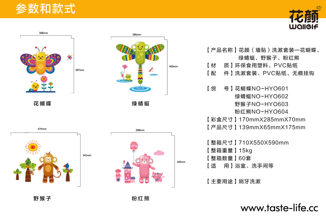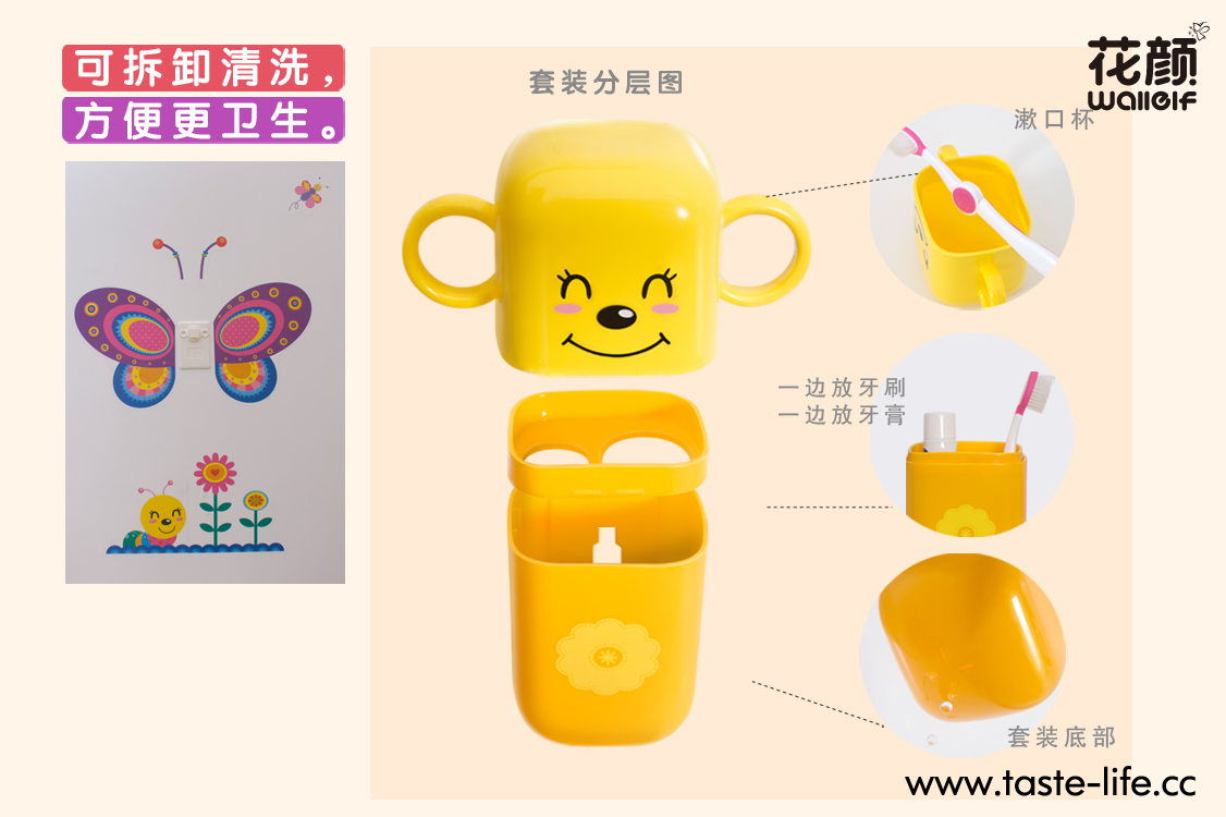 花颜墙贴洗漱套装,将墙贴与洗漱套装完美的跨界结合,彻底告别传统、呆板的洗漱套装形象!可爱的动物造型,不仅给家增添亮丽风景,还能让孩子自觉刷牙,在玩乐中爱上刷牙哦!配上亲子互动墙贴,增进亲子关系的同时,还能培养孩子的动手能力呢!
