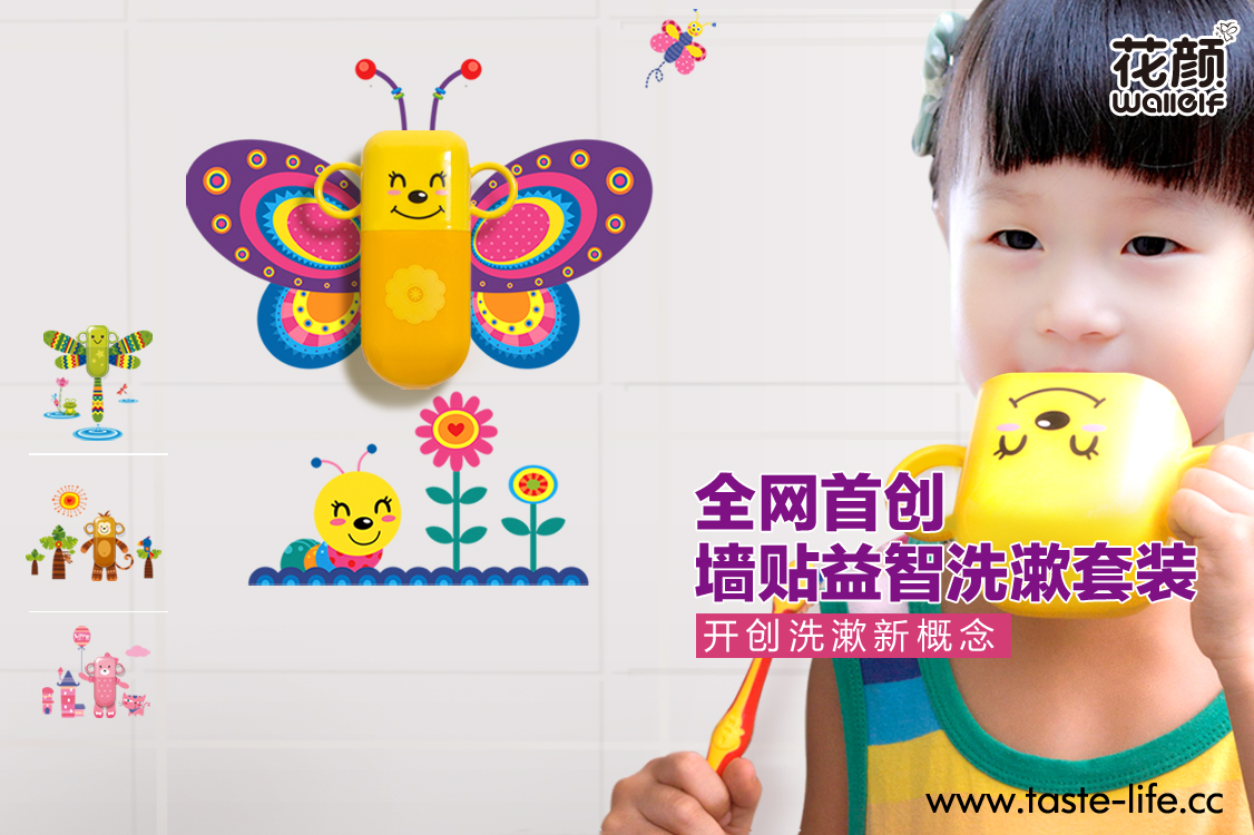 花颜墙贴洗漱套装,将墙贴与洗漱套装完美的跨界结合,彻底告别传统、呆板的洗漱套装形象!可爱的动物造型,配上亲子互动墙贴,增进亲子关系,给家增添亮丽风景,让孩子自觉刷牙,在玩乐中爱上刷牙!