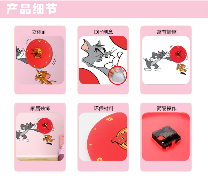 | 创意说明: | 猫和老鼠-功能性墙贴挂钟,这是一款集时间显示与家居装饰功能于一体的“3D可移除式墙贴挂钟”环保产品,采用全新透明环保贴纸与优质环保塑料为制作材料,通过优良的工艺打造而成。创意钟饰与卡通幽默的贴纸图案相结合,画面滑稽搞笑,让你在观看时间的同时也能捧腹一笑,增添生活情趣。立体墙贴遇上艺术挂钟,随爱DIY,尽显3D、环保便利创意家居品味。 |